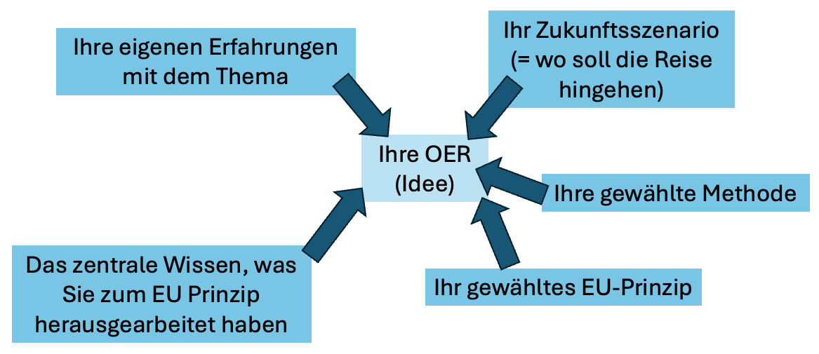 In Woche 4 begannen wir mit der Entwicklung der OER. Als ersten Schritt entwickelten die Studierenden Szenarien in Form von kreativen Kurzgeschichten, die den aktuellen Stand der Technologienutzung in der Bildung in Bezug auf ihr EU-Prinzip beschreiben, beispielsweise wie undurchsichtig die Datenverarbeitung und Ergebniserstellung von Large Language Models ist. Mit Hilfe einer spekulativen Zukunftsmethode entwickelten sie dann ideale Szenarien für jedes Prinzip: Wie würde für Sie eine zukünftige Nutzung von Technologien aussehen, die dieses EU-Prinzip perfekt umsetzt? Dieses Zukunftsszenario bildete das Ziel der OER: Auf diese Zukunft wollen die OER hinarbeiten.
