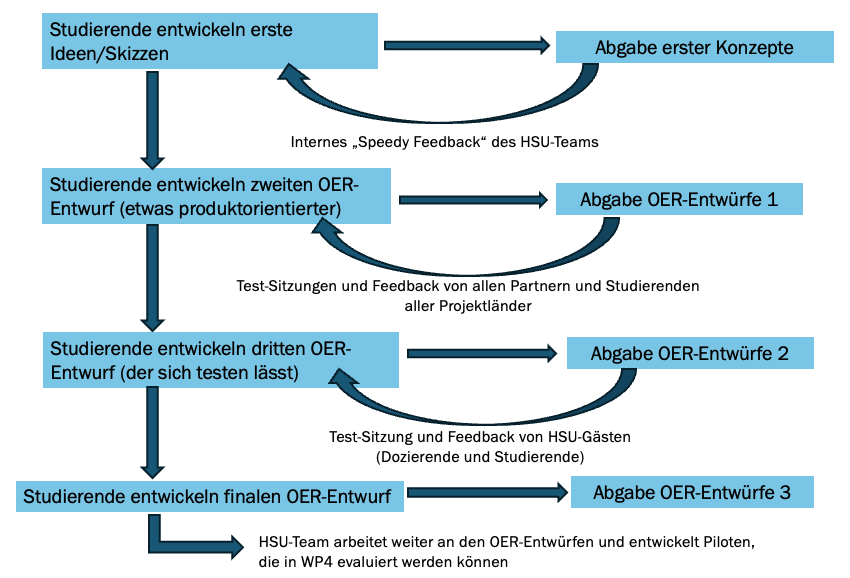 Auf Grundlage ihres erlangten Wissens über das EU-Prinzip, ihrer Zukunftsszenarien, ihrer eigenen Erfahrungen mit dem Einsatz von Technologie im Bildungsbereich und ihrer ausgewählten Co-Design-Methode begannen die Studierenden dann mit der Entwicklung ihrer ersten Ideen für ihre OER. Dies war der Start eines mehrstufigen Test- und Feedbackprozesses (siehe Abbildung).